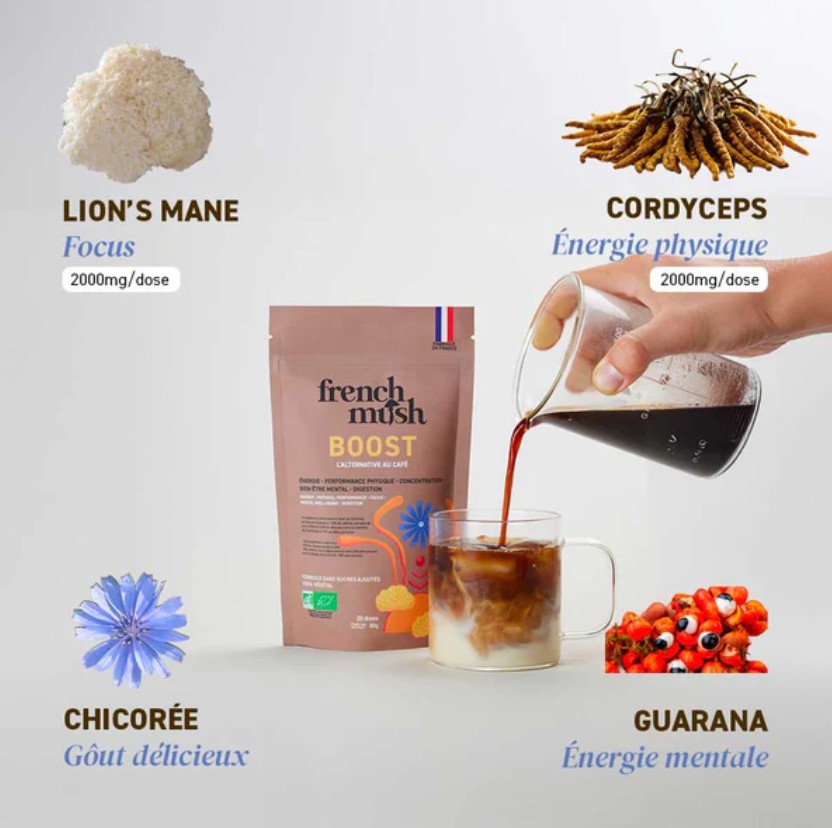 Une boisson à base de champignons biologiques, gourmande et naturelle pour accompagner les journées actives avec confort et clarté.